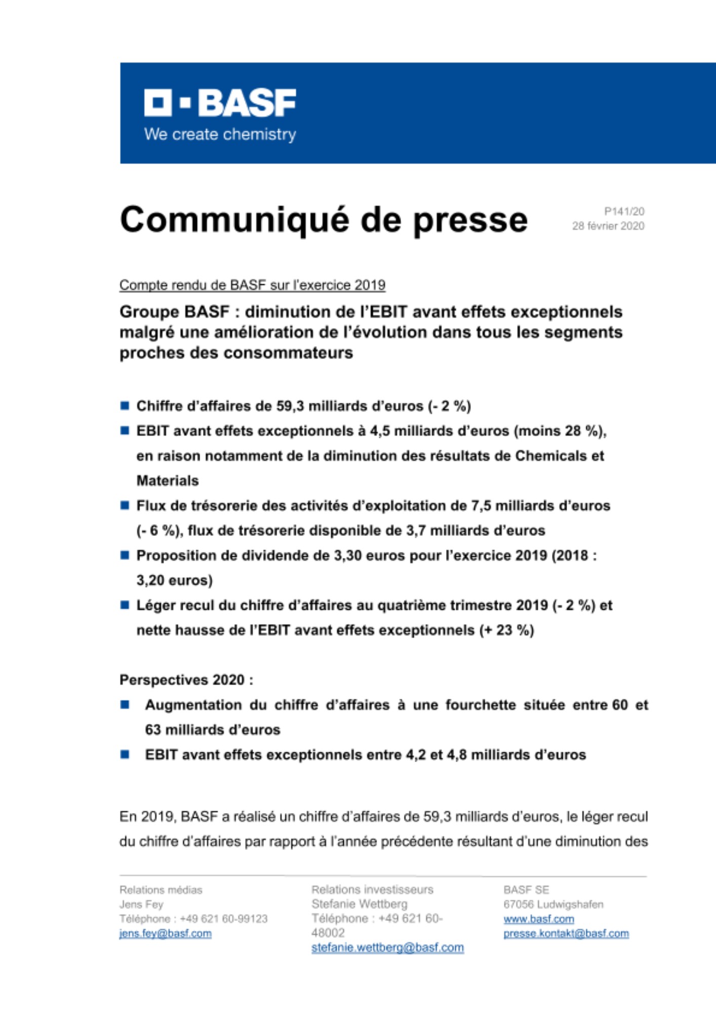 En 2019, BASF a réalisé un chiffre d’affaires de 59,3 milliards d’euros, le léger recul du chiffre d’affaires par rapport à l’année précédente résultant d’une diminution des volumes et des prix. Le résultat des activités d’exploitation (EBIT) avant effets exceptionnels s’est élevé à 4,5 milliards d’euros, en baisse de 1,7 milliard par rapport à l’année précédente, en raison d’une diminution des contributions des segments Materials et Chemicals.