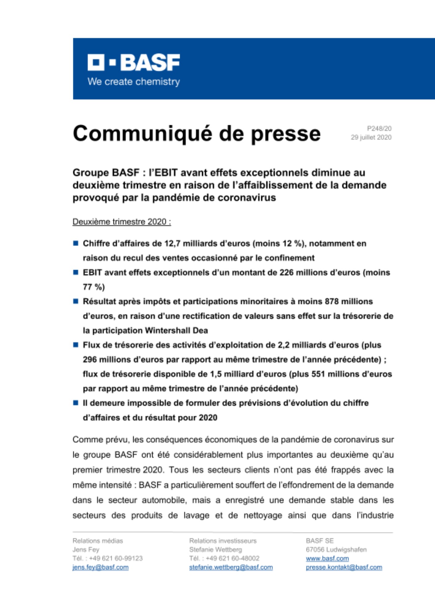 Groupe BASF : l’EBIT avant effets exceptionnels diminue au deuxième trimestre en raison de l’affaiblissement de la demande provoqué par la pandémie de coronavirus
