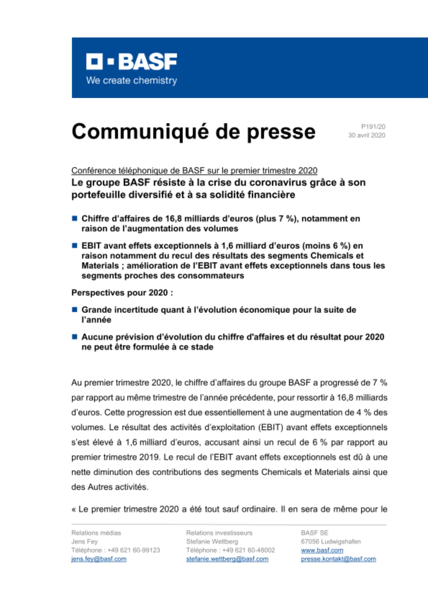 Au premier trimestre 2020, le chiffre d’affaires du groupe BASF a progressé de 7 % par rapport au même trimestre de l’année précédente, pour ressortir à 16,8 milliards d’euros. Cette progression est due essentiellement à une augmentation de 4 % des volumes. Le résultat des activités d’exploitation (EBIT) avant effets exceptionnels s’est élevé à 1,6 milliard d’euros, accusant ainsi un recul de 6 % par rapport au premier trimestre 2019. Le recul de l’EBIT avant effets exceptionnels est dû à une nette diminution des contributions des segments Chemicals et Materials ainsi que des Autres activités.