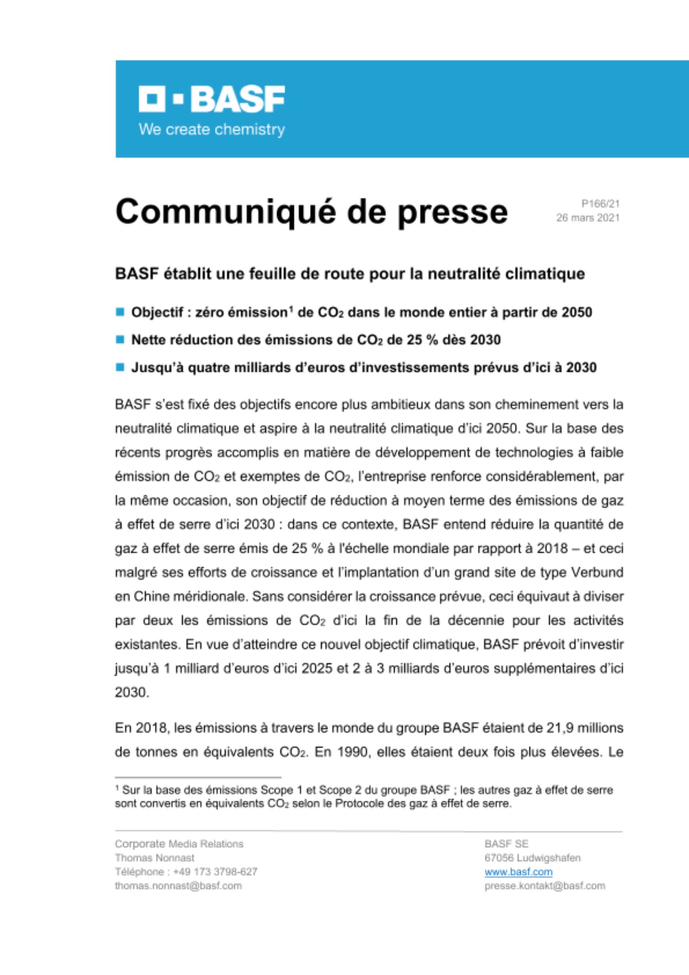 [1] Sur la base des émissions Scope 1 et Scope 2 du groupe BASF ; les autres gaz à effet de serre sont convertis en équivalents CO2 selon le Protocole des gaz à effet de serre.