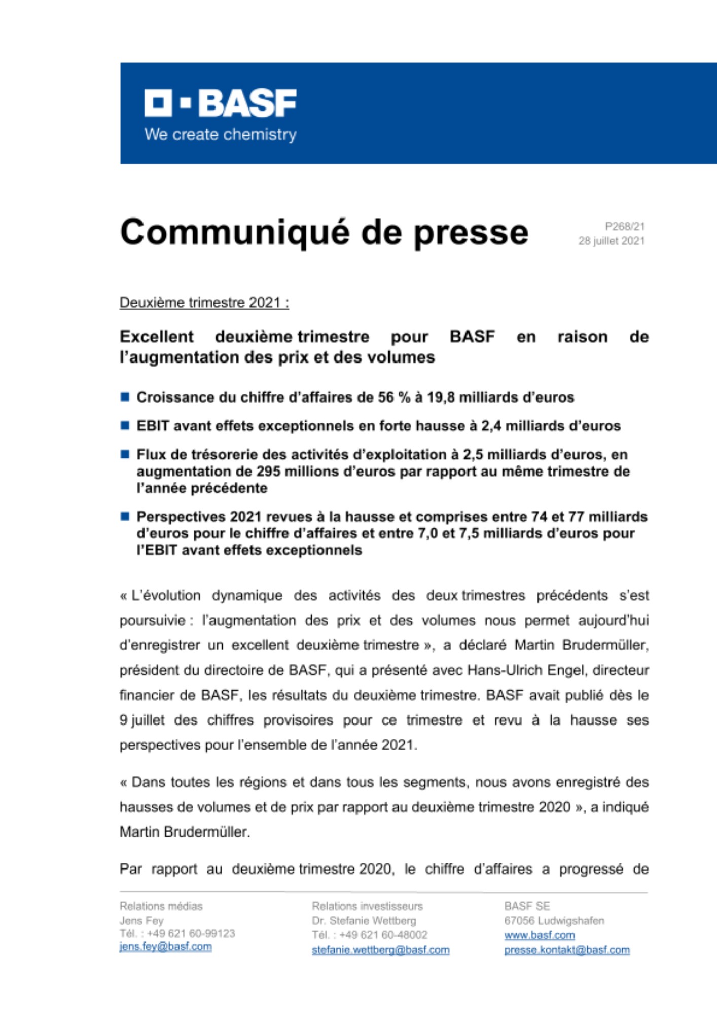 « Dans toutes les régions et dans tous les segments, nous avons enregistré des hausses de volumes et de prix par rapport au deuxième trimestre 2020 », a indiqué Martin Brudermüller.