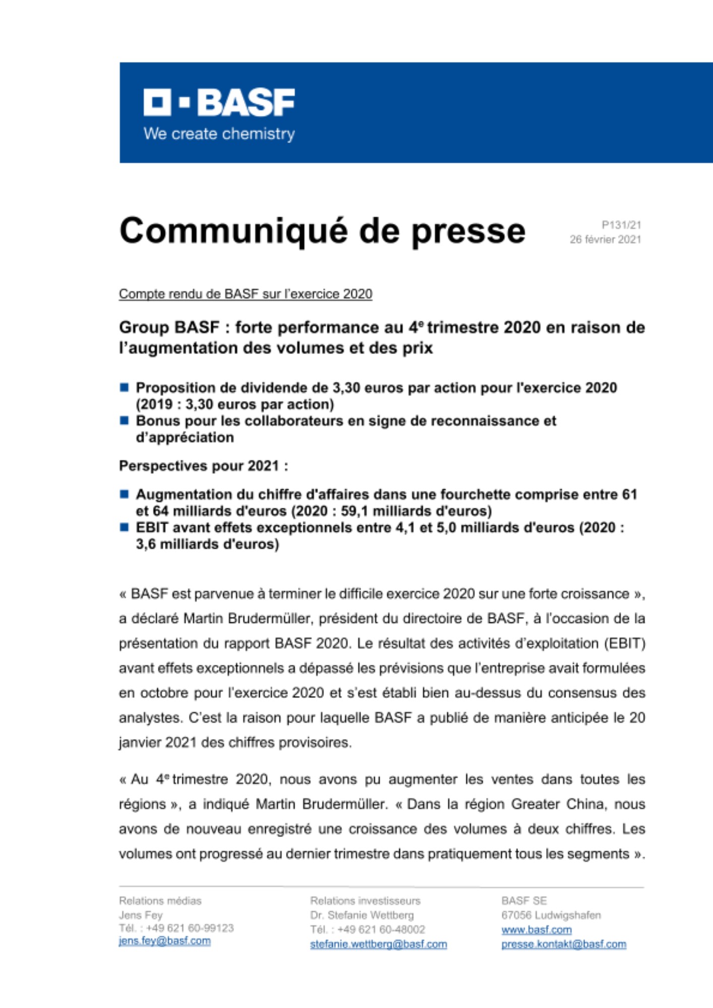 Group BASF : forte performance au 4e trimestre 2020 en raison de l’augmentation des volumes et des prix