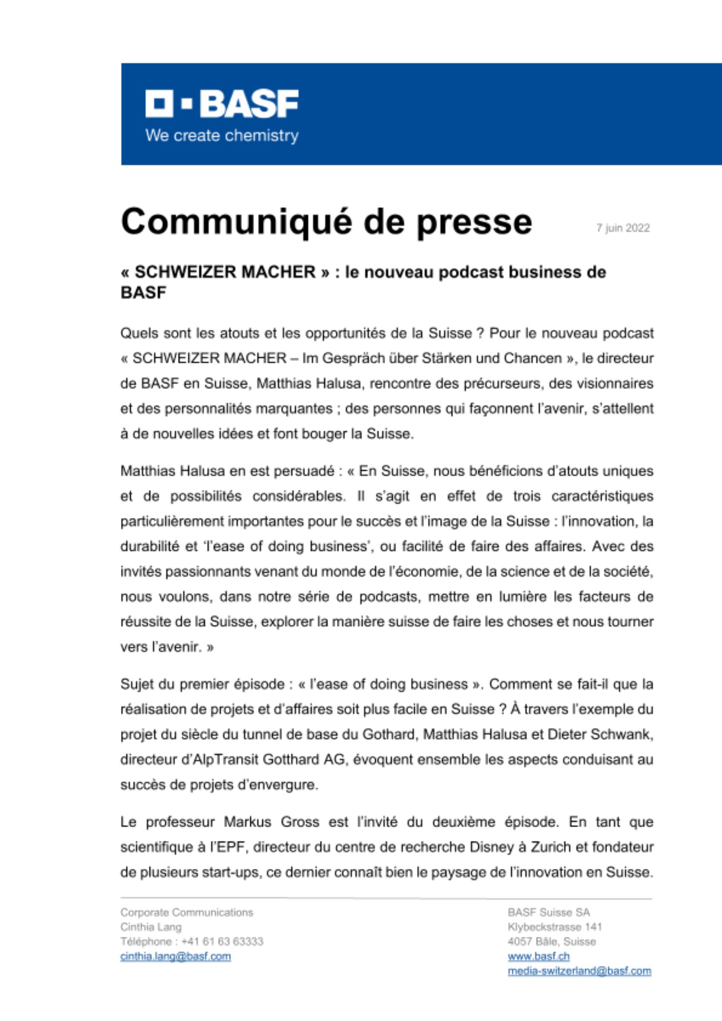« SCHWEIZER MACHER » : le nouveau podcast business de BASF