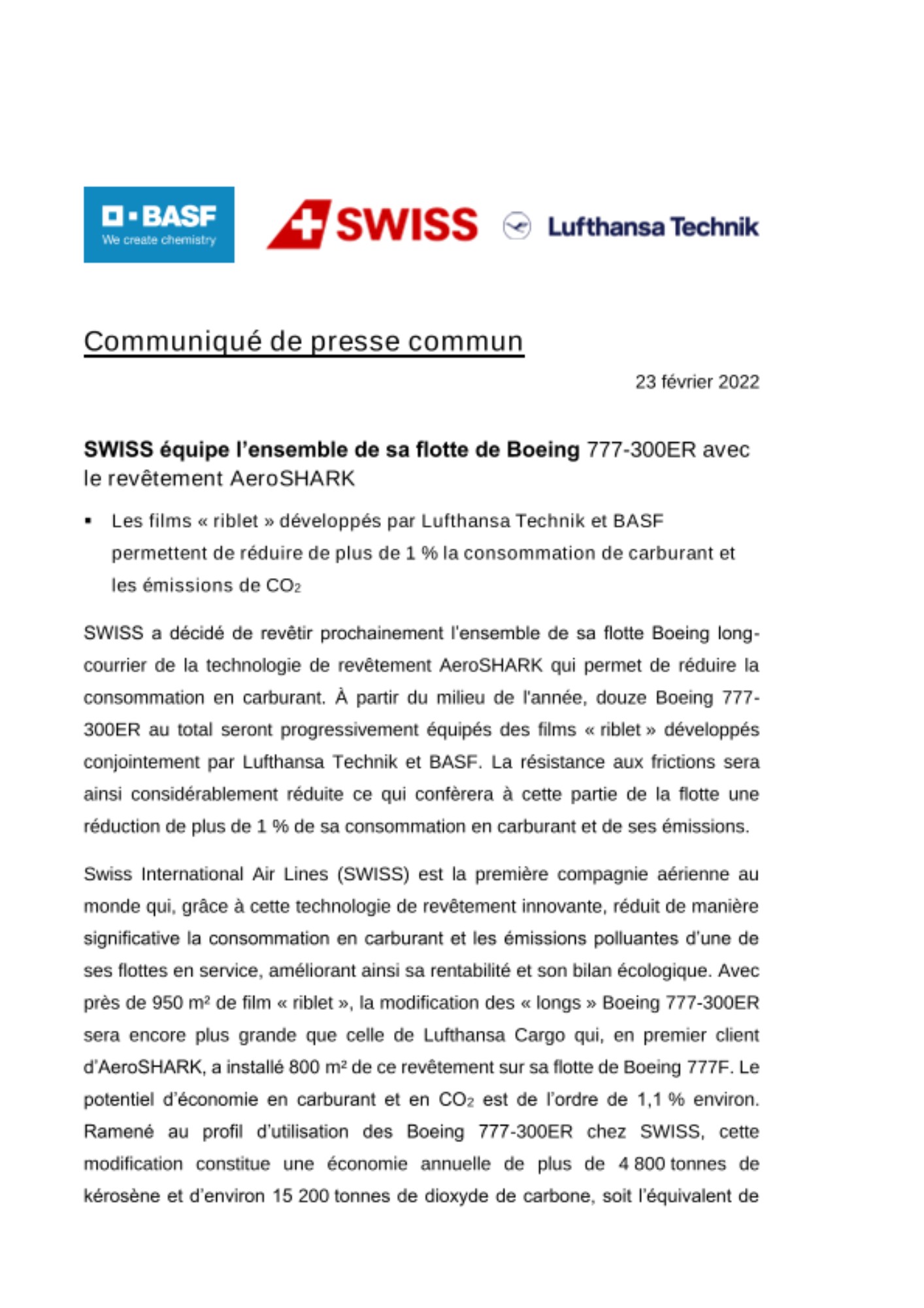 SWISS a décidé de revêtir prochainement l’ensemble de sa flotte Boeing long-courrier de la technologie de revêtement AeroSHARK qui permet de réduire la consommation en carburant. À partir du milieu de l'année, douze Boeing 777-300ER au total seront progressivement équipés des films « riblet » développés conjointement par Lufthansa Technik et BASF. La résistance aux frictions sera ainsi considérablement réduite ce qui confèrera à cette partie de la flotte une réduction de plus de 1 % de sa consommation en carburant et de ses émissions.