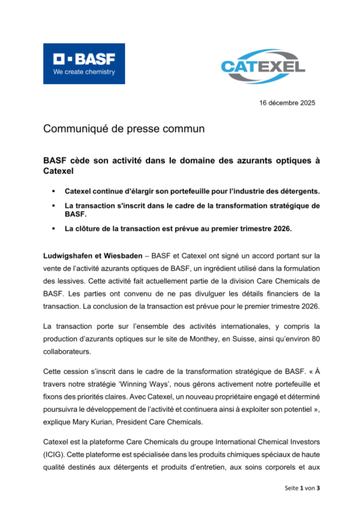 Ludwigshafen et Wiesbaden – BASF et Catexel ont signé un accord portant sur la vente de l’activité azurants optiques de BASF, un ingrédient utilisé dans la formulation des lessives. Cette activité fait actuellement partie de la division Care Chemicals de BASF. Les parties ont convenu de ne pas divulguer les détails financiers de la transaction. La conclusion de la transaction est prévue pour le premier trimestre 2026.