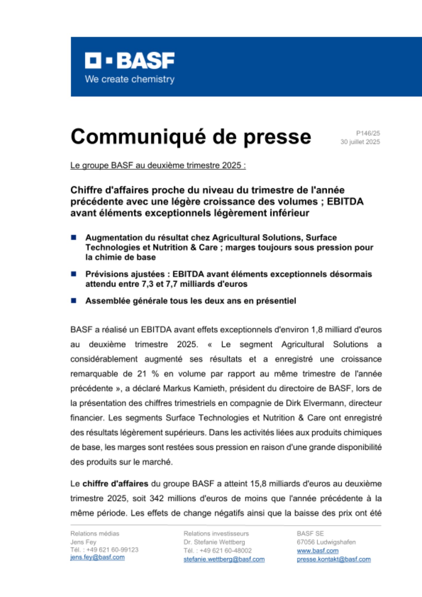 Le chiffre d'affaires du groupe BASF a atteint 15,8 milliards d'euros au deuxième trimestre 2025, soit 342 millions d'euros de moins que l'année précédente à la même période. Les effets de change négatifs ainsi que la baisse des prix ont été pour cela déterminants. La baisse des prix a été principalement imputable au segment Chemicals, tandis que Surface Technologies et Nutrition & Care ont amélioré leurs prix. L'évolution positive des volumes d'Agricultural Solutions, de Surface Technologies et de Materials a permis de compenser en partie la baisse des ventes.