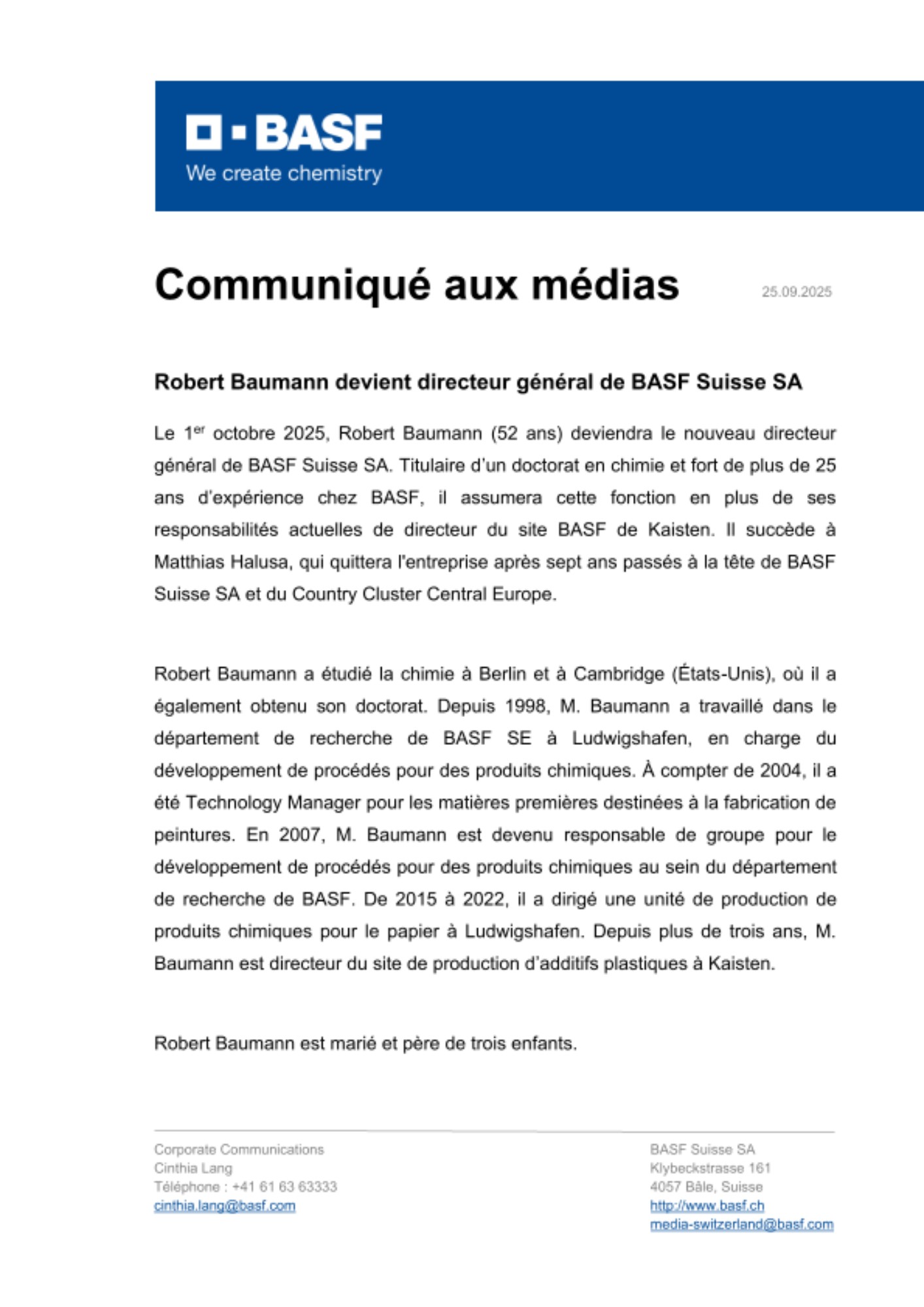 Le 1er octobre 2025, Robert Baumann (52 ans) deviendra le nouveau directeur général de BASF Suisse SA. Titulaire d’un doctorat en chimie et fort de plus de 25 ans d’expérience chez BASF, il assumera cette fonction en plus de ses responsabilités actuelles de directeur du site BASF de Kaisten. Il succède à Matthias Halusa, qui quittera l’entreprise après sept ans passés à la tête de BASF Suisse SA et du Country Cluster Central Europe.