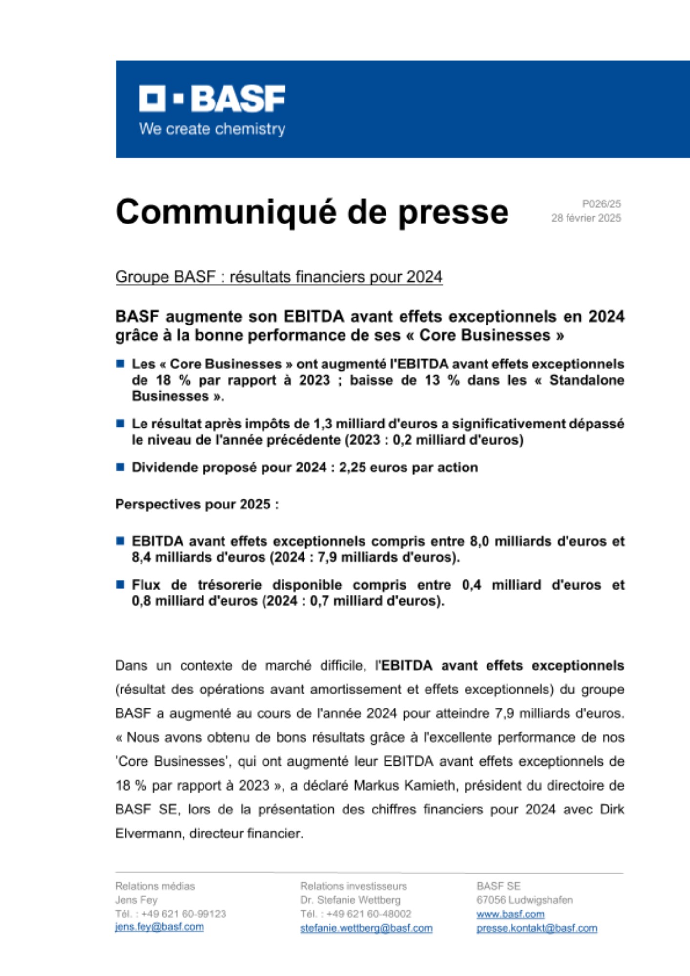 Dans un contexte de marché difficile, l'EBITDA avant effets exceptionnels (résultat des opérations avant amortissement et effets exceptionnels) du groupe BASF a augmenté au cours de l'année 2024 pour atteindre 7,9 milliards d'euros. « Nous avons obtenu de bons résultats grâce à l'excellente performance de nos ’Core Businesses’, qui ont augmenté leur EBITDA avant effets exceptionnels de 18 % par rapport à 2023 », a déclaré Markus Kamieth, président du directoire de BASF SE, lors de la présentation des chiffres financiers pour 2024 avec Dirk Elvermann, directeur financier. Dans l'ensemble, l'EBITDA avant effets exceptionnels du groupe BASF a augmenté de 2 %. Dans les « Core Businesses », l'EBITDA avant effets exceptionnels a considérablement augmenté, principalement en raison de l'accroissement des volumes. Cette hausse a été partiellement atténuée par la baisse des bénéfices dans les « Standalone Businesses ». Dans le segment Agricultural Solutions, l'EBITDA avant effets exceptionnels a diminué de manière significative, principalement en raison de l'évolution de l'activité glufosinate-ammonium. La forte chute des prix des métaux précieux et la baisse des volumes de vente dans la division Catalysts ont été les principales raisons de la légère baisse des résultats de Surface Technologies. La marge EBITDA avant effets exceptionnels du groupe BASF a atteint 12,0 %, contre 11,1 % l'année précédente. Si l'on exclut les chiffres d’affaires des métaux précieux et non précieux, la marge EBITDA avant effets exceptionnels du groupe BASF est passée de 12,6 % en 2023 à 13,1 % en 2024.
