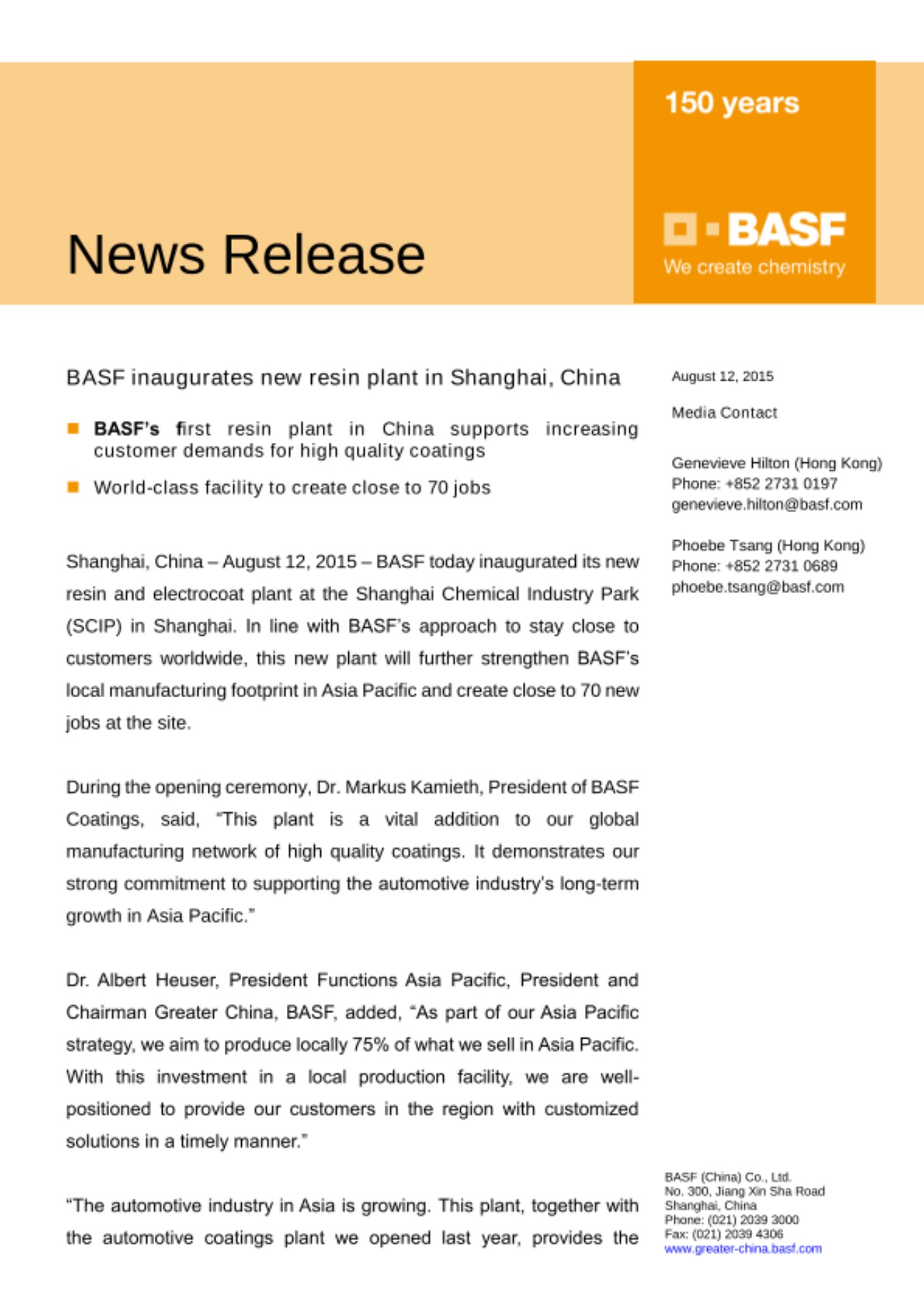 - BASF’s first resin plant in China supports increasing customer demands for high quality coatings