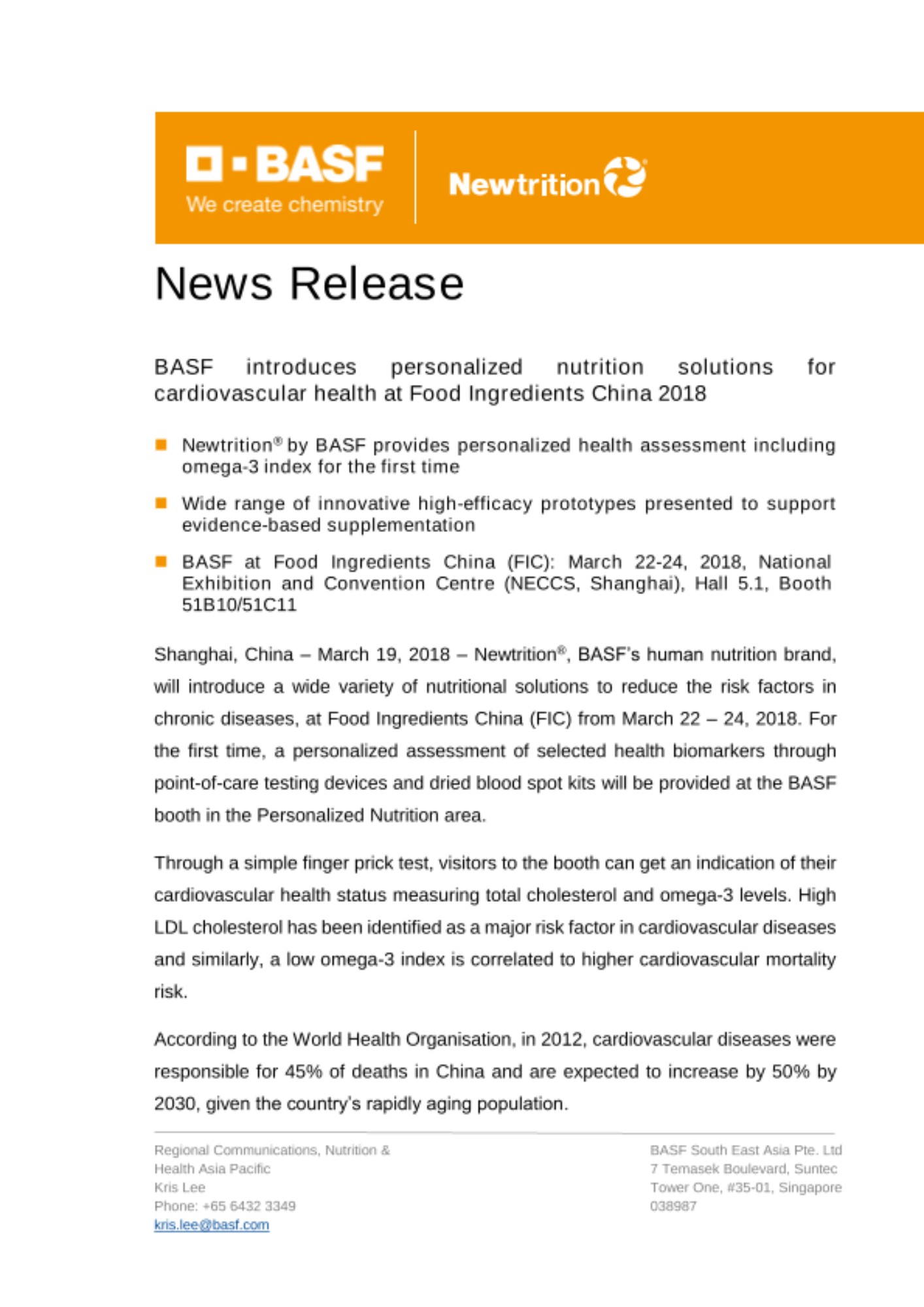 BASF introduces personalized nutrition solutions for cardiovascular health at Food Ingredients China 2018
