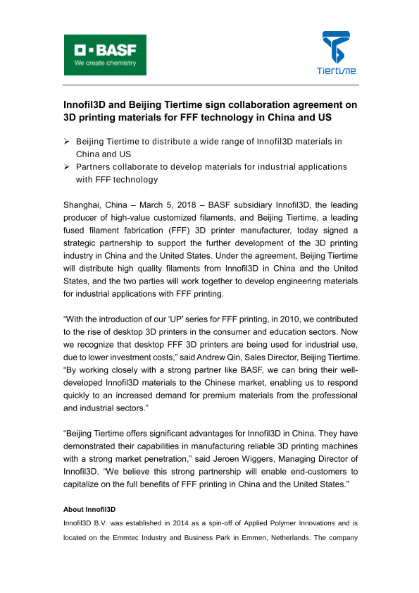 Shanghai, China – March 5, 2018 – BASF subsidiary Innofil3D, the leading producer of high-value customized filaments, and Beijing Tiertime, a leading fused filament fabrication (FFF) 3D printer manufacturer, today signed a strategic partnership to support the further development of the 3D printing industry in China and the United States. Under the agreement, Beijing Tiertime will distribute high quality filaments from Innofil3D in China and the United States, and the two parties will work together to develop engineering materials for industrial applications with FFF printing.
