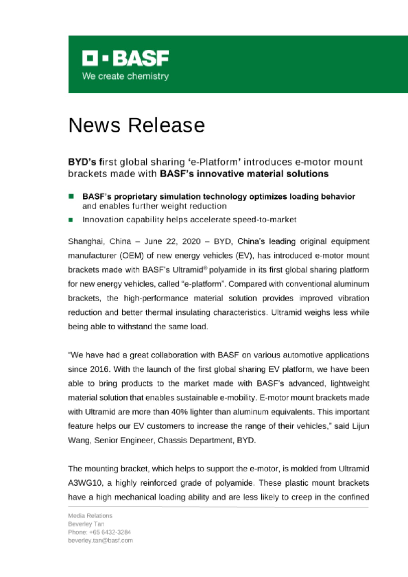 “We have had a great collaboration with BASF on various automotive applications since 2016. With the launch of the first global sharing EV platform, we have been able to bring products to the market made with BASF’s advanced, lightweight material solution that enables sustainable e-mobility. E-motor mount brackets made with Ultramid are more than 40% lighter than aluminum equivalents. This important feature helps our EV customers to increase the range of their vehicles,” said Lijun Wang, Senior Engineer, Chassis Department, BYD.