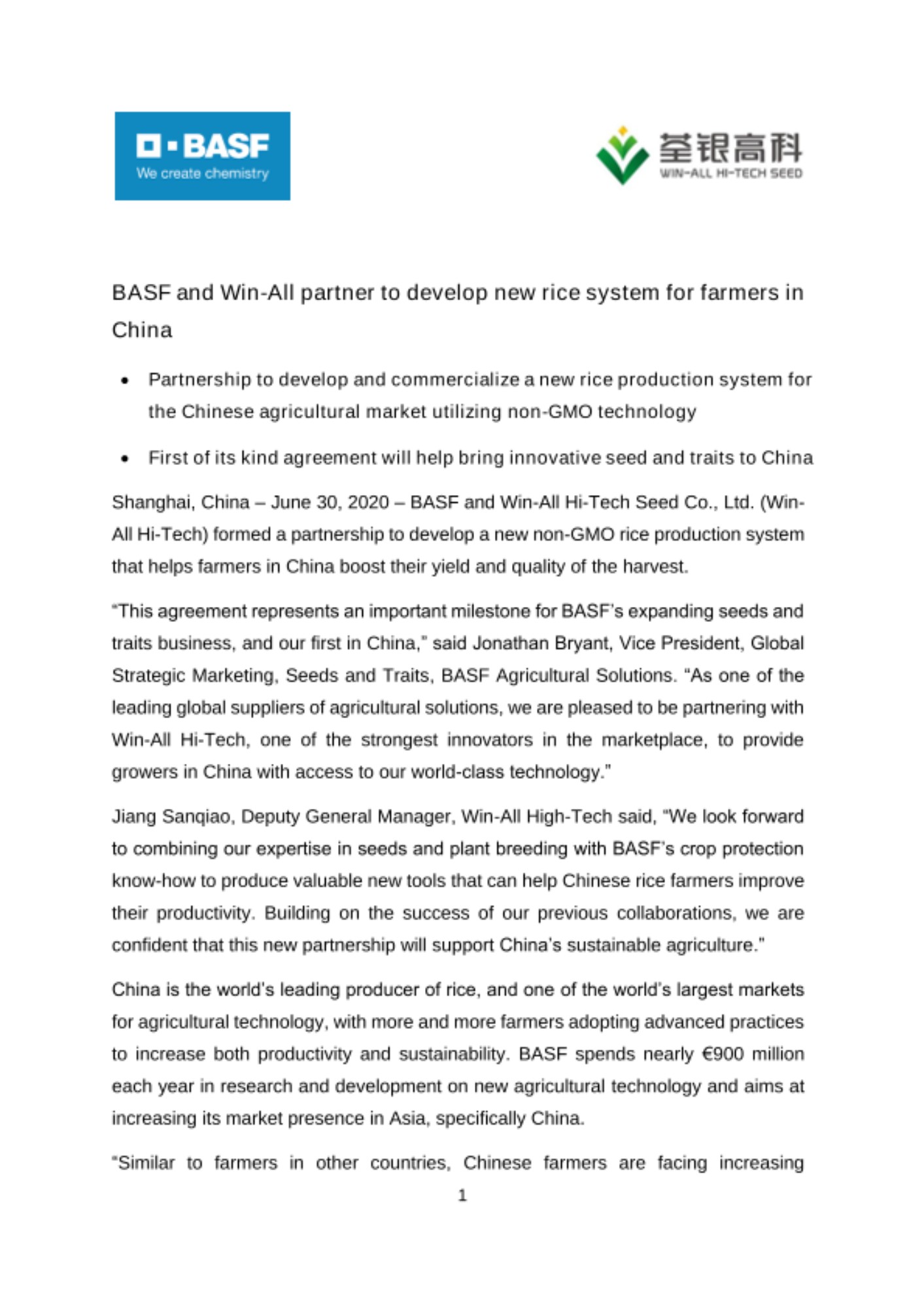 Shanghai, China – June 30, 2020 – BASF and Win-All Hi-Tech Seed Co., Ltd. (Win-All Hi-Tech) formed a partnership to develop a new non-GMO rice production system that helps farmers in China boost their yield and quality of the harvest.