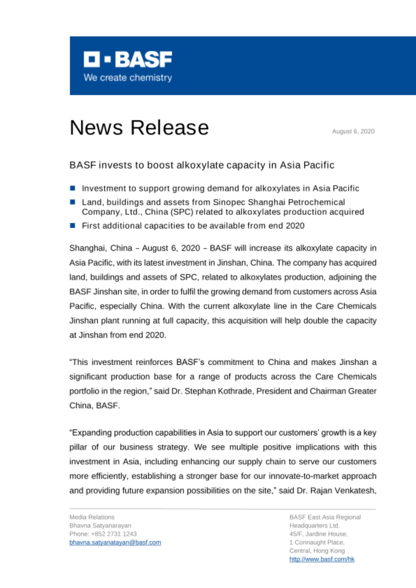 Shanghai, China – August 6, 2020 – BASF will increase its alkoxylate capacity in Asia Pacific, with its latest investment in Jinshan, China. The company has acquired land, buildings and assets of SPC, related to alkoxylates production, adjoining the BASF Jinshan site, in order to fulfil the growing demand from customers across Asia Pacific, especially China. With the current alkoxylate line in the Care Chemicals Jinshan plant running at full capacity, this acquisition will help double the capacity at Jinshan from end 2020.