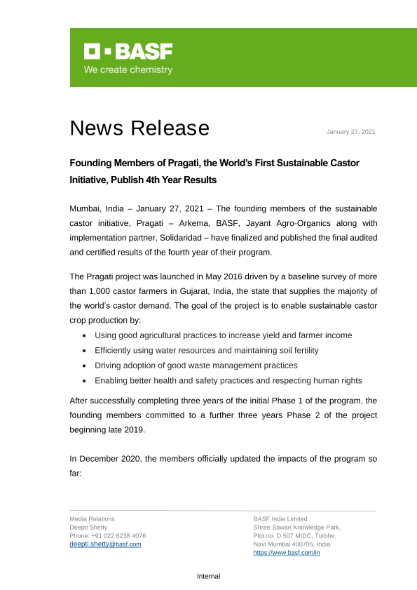 Mumbai, India – January 27, 2021 – The founding members of the sustainable castor initiative, Pragati – Arkema, BASF, Jayant Agro-Organics along with implementation partner, Solidaridad – have finalized and published the final audited and certified results of the fourth year of their program.