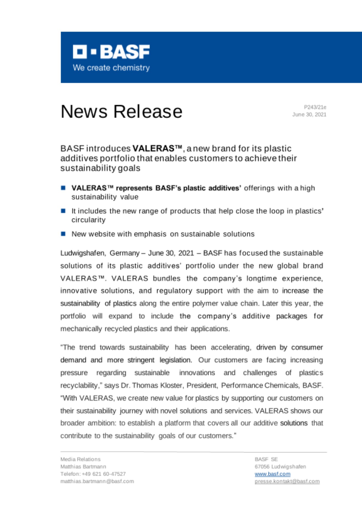 “The trend towards sustainability has been accelerating, driven by consumer demand and more stringent legislation. Our customers are facing increasing pressure regarding sustainable innovations and challenges of plastics recyclability,” says Dr. Thomas Kloster, President, Performance Chemicals, BASF. “With VALERAS, we create new value for plastics by supporting our customers on their sustainability journey with novel solutions and services. VALERAS shows our broader ambition: to establish a platform that covers all our additive solutions that contribute to the sustainability goals of our customers.”