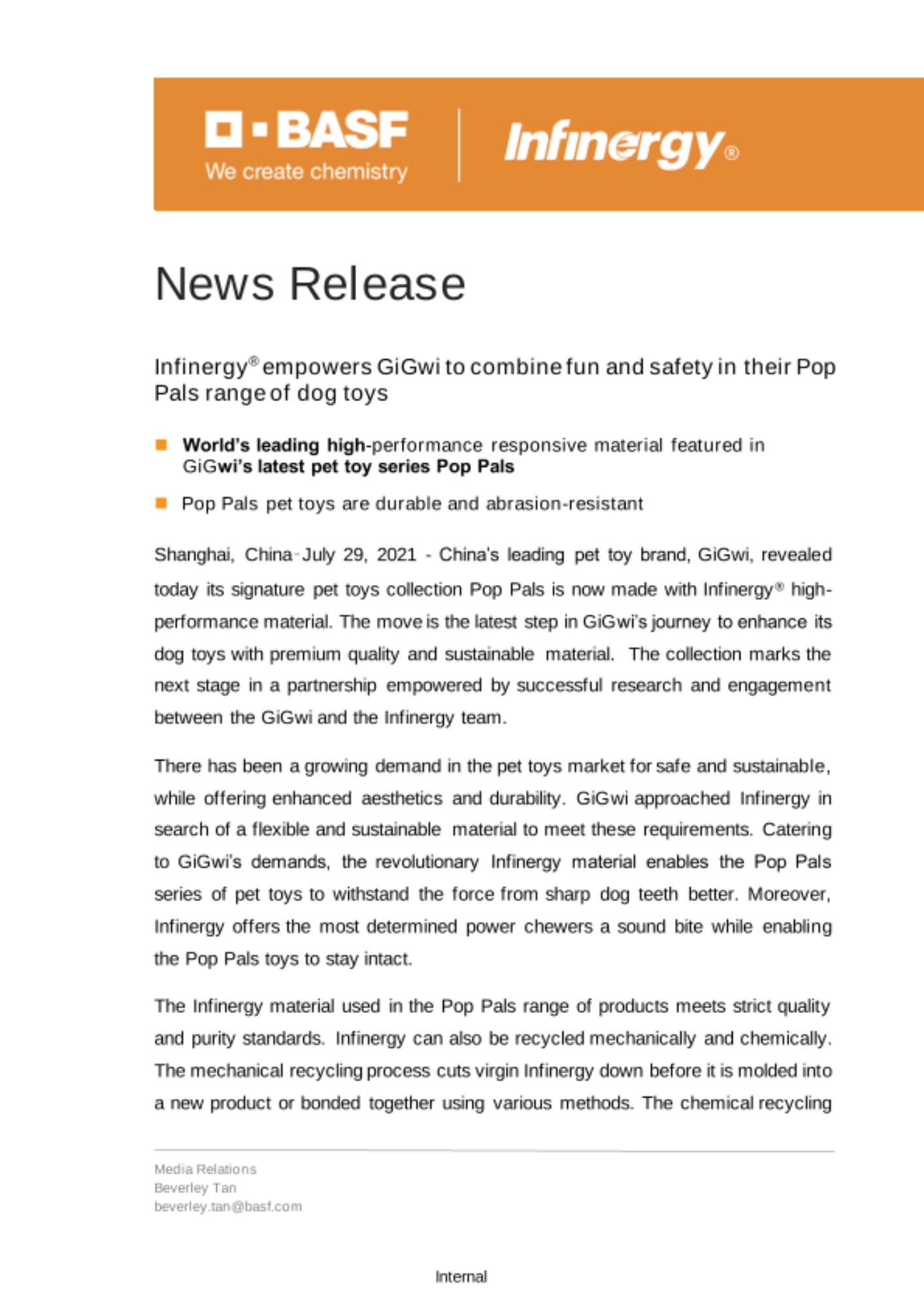 Shanghai, China–July 29, 2021 - China’s leading pet toy brand, GiGwi, revealed today its signature pet toys collection Pop Pals is now made with Infinergy® high-performance material. The move is the latest step in GiGwi’s journey to enhance its dog toys with premium quality and sustainable material. The collection marks the next stage in a partnership empowered by successful research and engagement between the GiGwi and the Infinergy team.