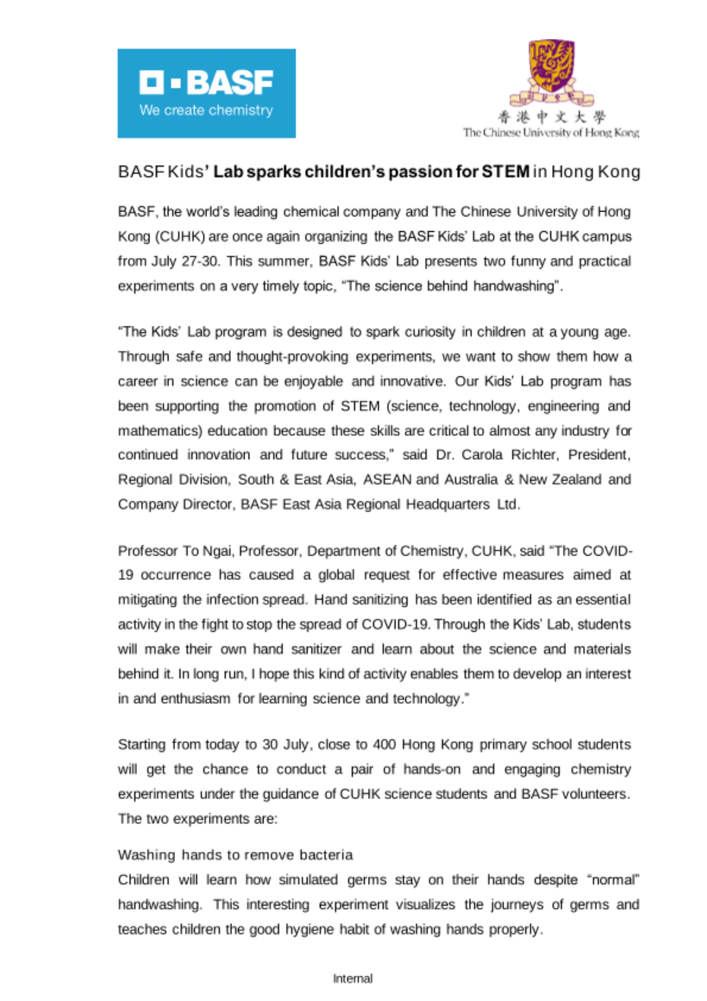 BASF, the world’s leading chemical company and The Chinese University of Hong Kong (CUHK) are once again organizing the BASF Kids’ Lab at the CUHK campus from July 27-30. This summer, BASF Kids’ Lab presents two funny and practical experiments on a very timely topic, “The science behind handwashing”.
