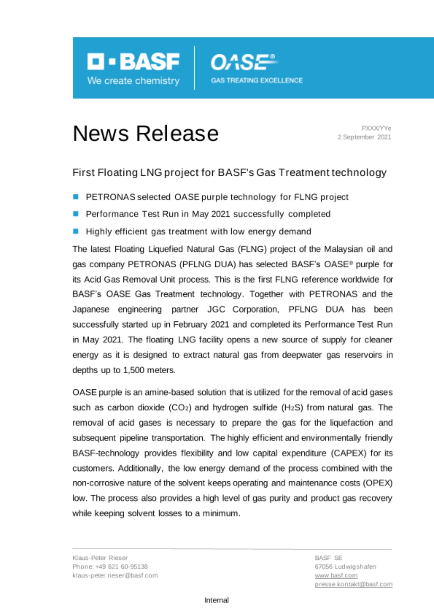 The latest Floating Liquefied Natural Gas (FLNG) project of the Malaysian oil and gas company PETRONAS (PFLNG DUA) has selected BASF’s OASE® purple for its Acid Gas Removal Unit process. This is the first FLNG reference worldwide for BASF’s OASE Gas Treatment technology. Together with PETRONAS and the Japanese engineering partner JGC Corporation, PFLNG DUA has been successfully started up in February 2021 and completed its Performance Test Run in May 2021. The floating LNG facility opens a new source of supply for cleaner energy as it is designed to extract natural gas from deepwater gas reservoirs in depths up to 1,500 meters.