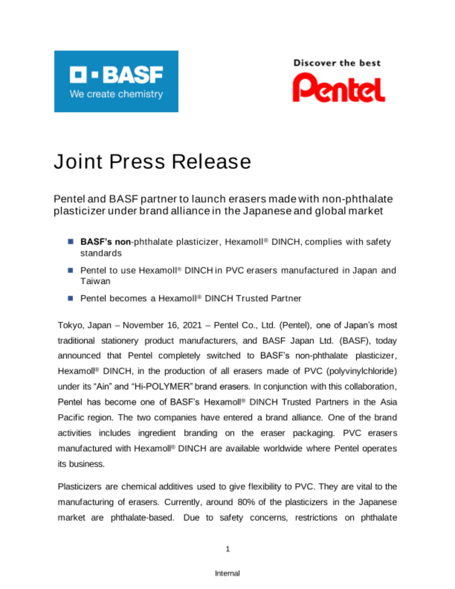 Tokyo, Japan – November 16, 2021 – Pentel Co., Ltd. (Pentel), one of Japan’s most traditional stationery product manufacturers, and BASF Japan Ltd. (BASF), today announced that Pentel completely switched to BASF’s non-phthalate plasticizer, Hexamoll® DINCH, in the production of all erasers made of PVC (polyvinylchloride) under its “Ain” and “Hi-POLYMER” brand erasers. In conjunction with this collaboration, Pentel has become one of BASF’s Hexamoll® DINCH Trusted Partners in the Asia Pacific region. The two companies have entered a brand alliance. One of the brand activities includes ingredient branding on the eraser packaging. PVC erasers manufactured with Hexamoll® DINCH are available worldwide where Pentel operates its business.