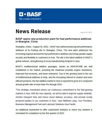 BASF opens new production plant for fuel performance additives in Shanghai, China