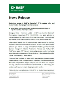 Shanghai, China – November 1, 2022 – BASF today launched Elastollan® Thermoplastic Polyurethane (TPU) 1180A10WDM, a new grade optimized for charging cables of fast charging piles. As the new grade is softer, it is more flexible and easier to handle than conventional charging cables of fast charging piles.