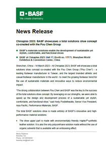 Shenzhen, China – 14 March 2023 – At Chinaplas 2023, BASF will showcase a total solutions shoe concept co-created with the Pou Chen Group (“Pou Chen”) - a leading footwear manufacturer in Taiwan, and the largest branded athletic and casual footwear manufacturer in the world - to meet the growing footwear trend for the use of sustainable materials and innovative ways to reduce environmental impact.