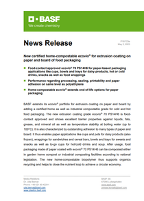 BASF extends its ecovio® portfolio for extrusion coating on paper and board by adding a certified home as well as industrial compostable grade for cold and hot food packaging. The new extrusion coating grade ecovio® 70 PS14H6 is food-contact approved and shows excellent barrier properties against liquids, fats, grease, and mineral oil as well as temperature stability at boiling water (up to 100°C). It is also characterized by outstanding adhesion to many types of paper and board. It thus enables paper applications like cups and pots for dairy products (also frozen), wrappings for sandwiches and cereal bars, bowls and trays for sweets and snacks as well as to-go cups for hot/cold drinks and soup. After usage, food packaging made of paper coated with ecovio® 70 PS14H6 can be composted either in garden home compost or industrial composting facilities according to national legislation. The new home-compostable biopolymer thus supports organics recycling and helps to close the nutrient loop to achieve a circular economy.