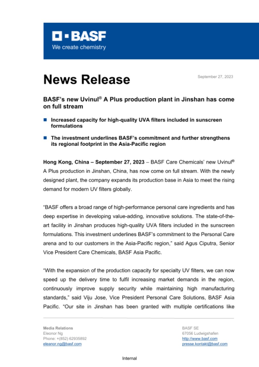“BASF offers a broad range of high-performance personal care ingredients and has deep expertise in developing value-adding, innovative solutions. The state-of-the-art facility in Jinshan produces high-quality UVA filters included in the sunscreen formulations. This investment underlines BASF’s commitment to the Personal Care arena and to our customers in the Asia-Pacific region,” said Agus Ciputra, Senior Vice President Care Chemicals, BASF Asia Pacific.