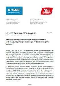 Suzhou, China, JAN 19, 2024 – BASF Monomers Division and Xuchuan Chemical, an important partner in the isocyanates value chain, held a ceremony to commemorate their strategic cooperation on bio-mass balanced (BMB) Methylene Diphenyl Di-isocyanate (MDI) in synthetic leather applications. By leveraging BASF's expertise in bio-mass balanced (BMB) MDI production and Xuchuan Chemical's extensive network in the synthetic leather value chain, the primary goal of this collaboration is to reduce carbon emissions in the production of polyurethanes for the industry.