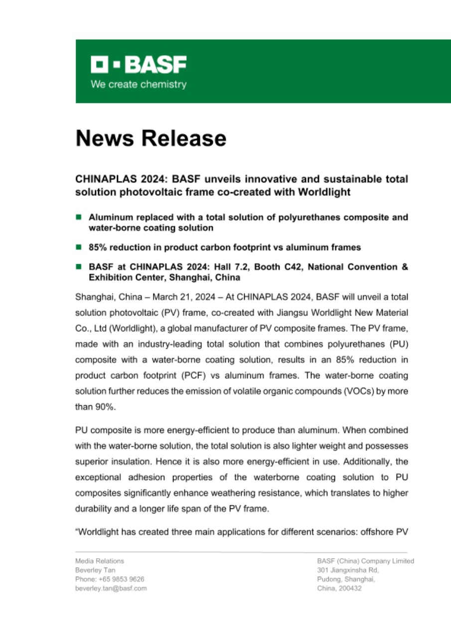 CHINAPLAS 2024: BASF unveils innovative and sustainable total solution photovoltaic frame co-created with Worldlight