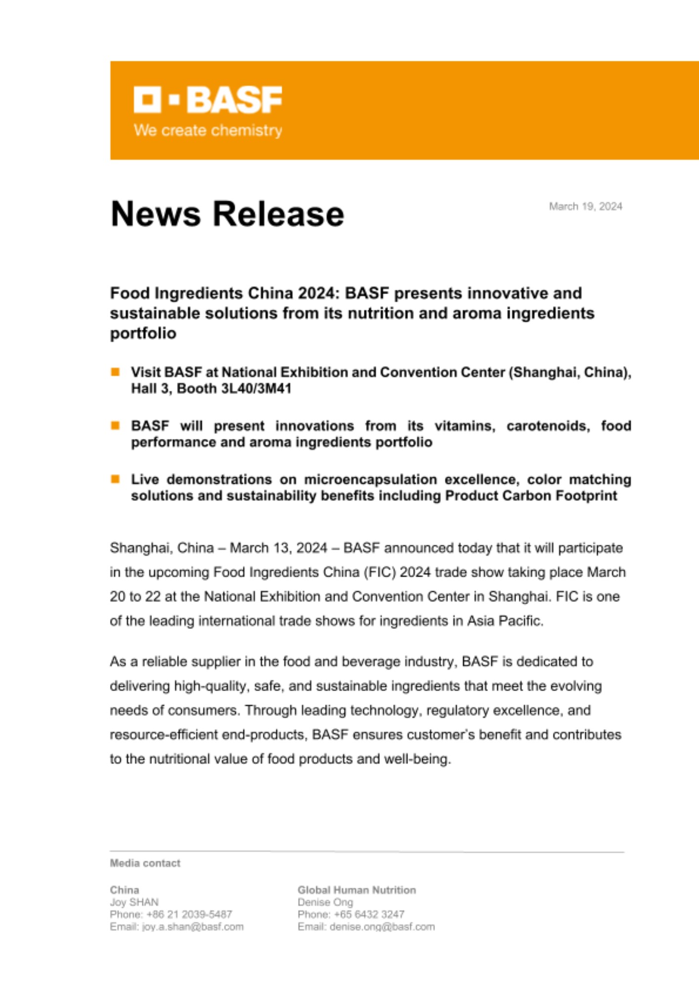 Shanghai, China – March 19, 2024 – BASF announced today that it will participate in the upcoming Food Ingredients China (FIC) 2024 trade show taking place March 20 to 22 at the National Exhibition and Convention Center in Shanghai. FIC is one of the leading international trade shows for ingredients in Asia Pacific.