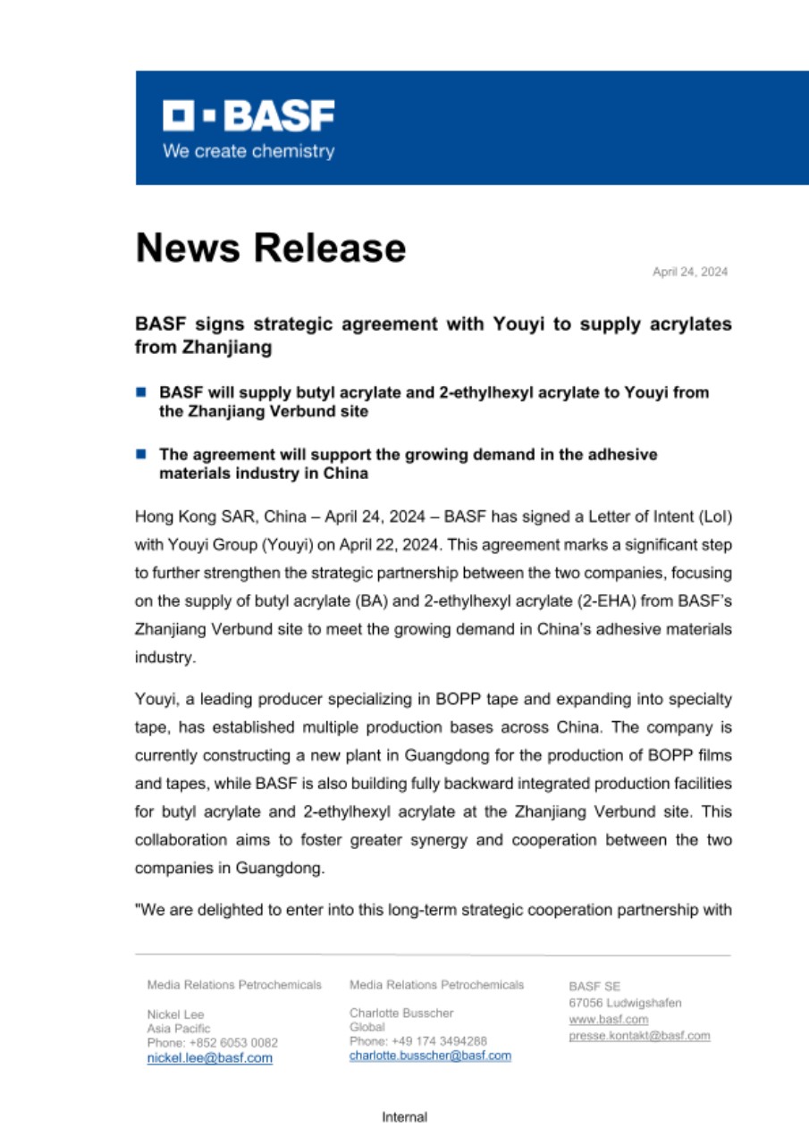 "We are delighted to enter into this long-term strategic cooperation partnership with Youyi, which marks the first customer agreement to supply acrylates from the Zhanjiang Verbund site," said Haibo Tian, Vice President, Industrial Petrochemicals Asia Pacific, BASF. "With the upcoming production startups of Youyi’s new production facility in Guangdong and BASF’s acrylic acid complex at our Zhanjiang Verbund site in 2025, we are confident that this agreement will create mutual benefits, ensuring competitiveness and reliability to support the growth of the adhesive tape industry.