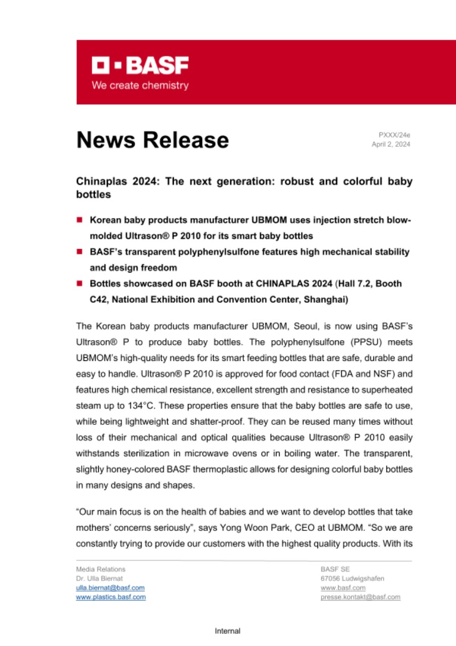 - Korean baby products manufacturer UBMOM uses injection stretch blow-molded Ultrason® P 2010 for its smart baby bottles