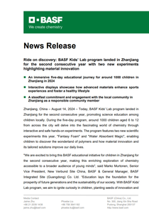 Zhanjiang, China – August 14, 2024 – Today, BASF Kids' Lab program landed in Zhanjiang for the second consecutive year, promoting science education among children locally. During the five-day program, approximately 1,000 children aged 6 to 12 from across the city will delve into the fascinating world of chemistry through interactive and safe hands-on experiments. The program features two new scientific experiments this year, "Fantasy Foam" and "Water Absorbent Magic", enabling children to discover the wonderland of polymers and how material innovation and its tailored solutions improve our daily lives.