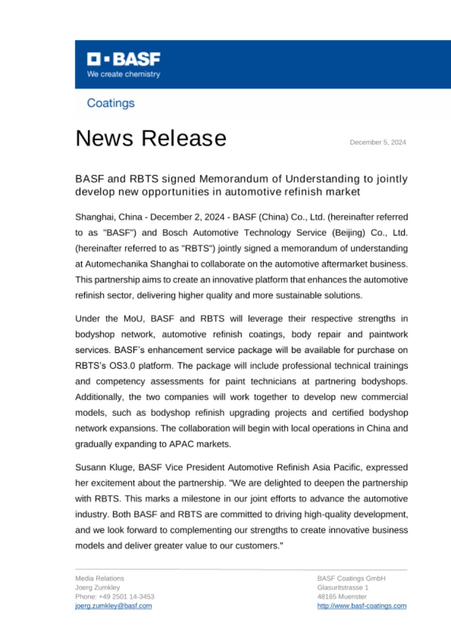 This partnership underscores BASF and RBTS’s shared commitment to the high-quality growth of the automotive refinish market. Looking ahead, the two companies will deepen their cooperation to foster innovation and promote sustainable development in the automotive aftermarket.