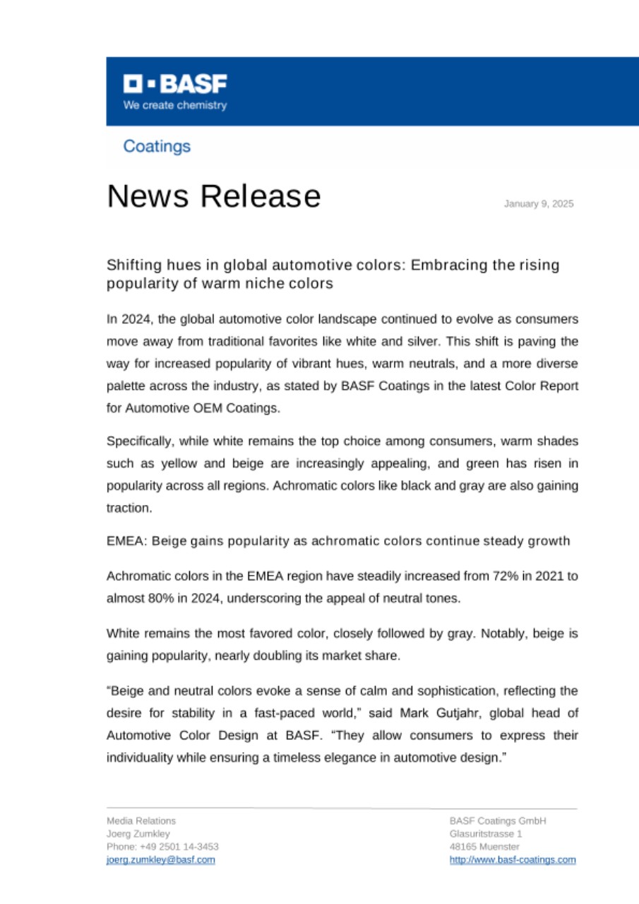 “Beige and neutral colors evoke a sense of calm and sophistication, reflecting the desire for stability in a fast-paced world,” said Mark Gutjahr, global head of Automotive Color Design at BASF. “They allow consumers to express their individuality while ensuring a timeless elegance in automotive design.”