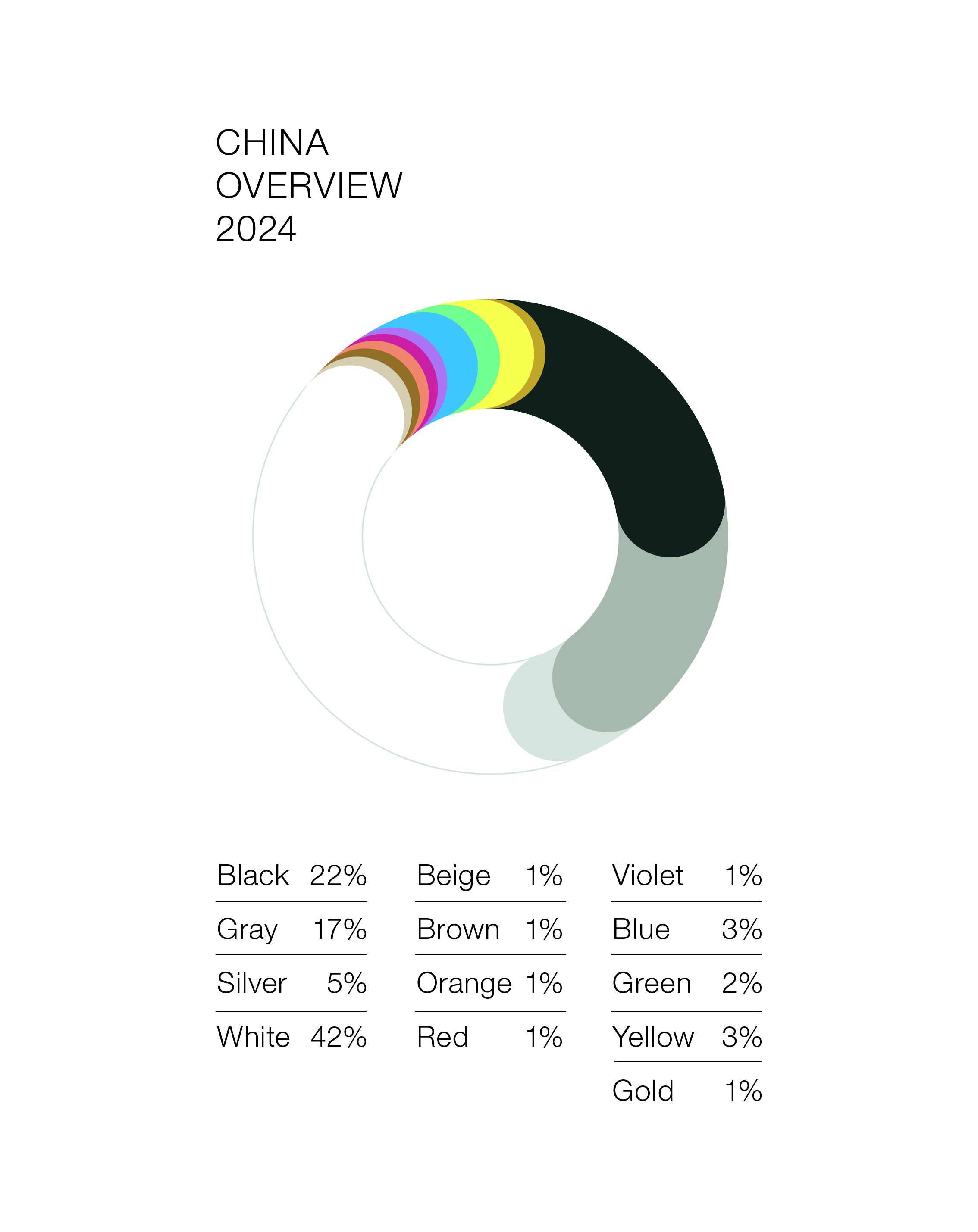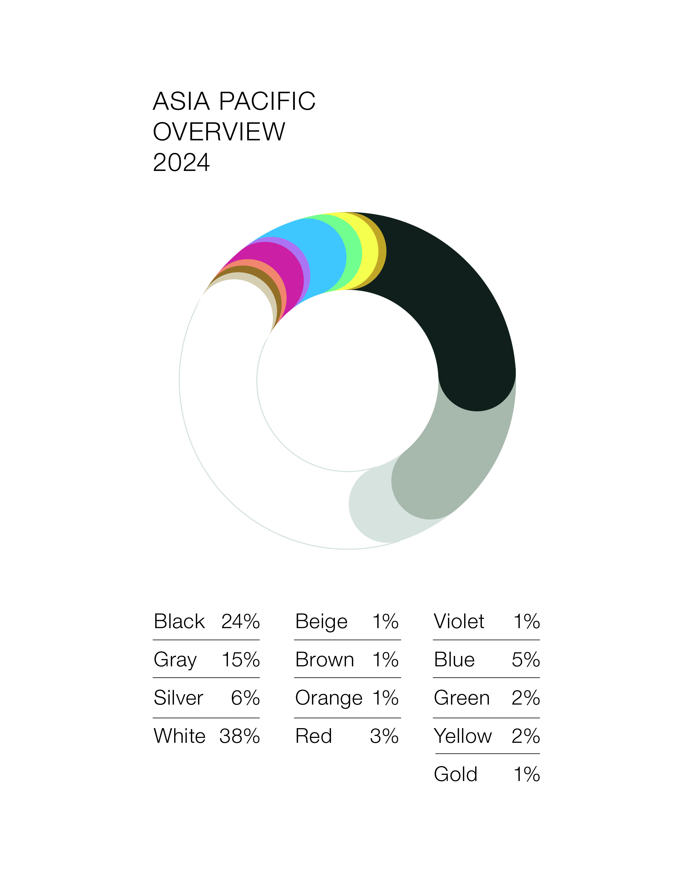 Achromatic colors remain the top choice for 83% of consumers, with black gaining 2 percentage points in popularity, reinforcing its association with elegance. In contrast, white has seen a decline of over 2 points.