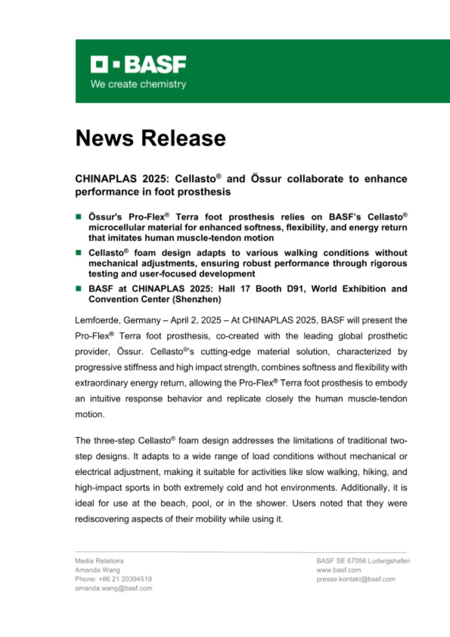 Lemfoerde, Germany – April 2, 2025 – At CHINAPLAS 2025, BASF will present the Pro-Flex® Terra foot prosthesis, co-created with the leading global prosthetic provider, Össur. Cellasto®’s cutting-edge material solution, characterized by progressive stiffness and high impact strength, combines softness and flexibility with extraordinary energy return, allowing the Pro-Flex® Terra foot prosthesis to embody an intuitive response behavior and replicate closely the human muscle-tendon motion.