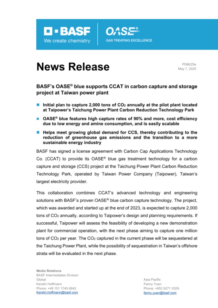Daniel Yao, Managing Director, CCAT, said, “In the context of the current environmental and energy transition, CCAT deeply understands the importance of promoting sustainable development and reducing carbon emissions. We are honored to undertake Taiwan’s first carbon capture commercial demonstration project and collaborate with BASF, utilizing its advanced OASE® blue technology. This partnership aims to enhance the technical level and outcomes of environmental protection projects. It will further drive the development of both parties in the green energy sector, while also providing Taipower with more efficient solutions to promote clean emissions in the energy production process.”