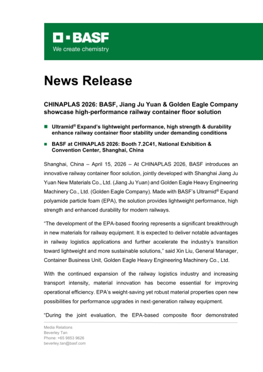 Shanghai, China – April 15, 2026 – At CHINAPLAS 2026, BASF introduces an innovative railway container floor solution, jointly developed with Shanghai Jiang Ju Yuan New Materials Co., Ltd. (Jiang Ju Yuan) and Golden Eagle Heavy Engineering Machinery Co., Ltd. (Golden Eagle Company). Made with BASF’s Ultramid® Expand polyamide particle foam (EPA), the solution provides lightweight performance, high strength and enhanced durability for modern railways.