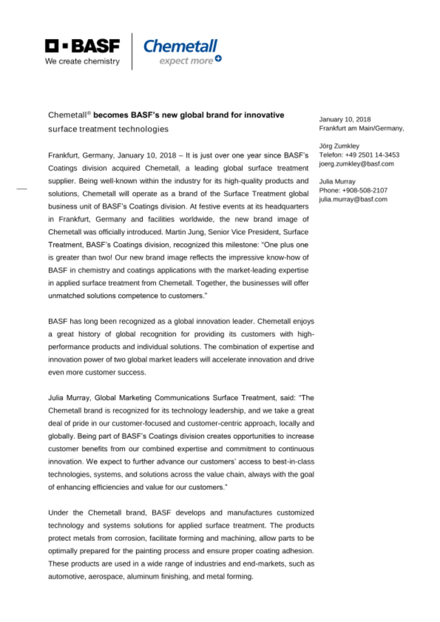 Frankfurt, Germany, January 10, 2018 – It is just over one year since BASF’s Coatings division acquired Chemetall, a leading global surface treatment supplier. Being well-known within the industry for its high-quality products and solutions, Chemetall will operate as a brand of the Surface Treatment global business unit of BASF’s Coatings division. At festive events at its headquarters in Frankfurt, Germany and facilities worldwide, the new brand image of Chemetall was officially introduced. Martin Jung, Senior Vice President, Surface Treatment, BASF’s Coatings division, recognized this milestone: “One plus one is greater than two! Our new brand image reflects the impressive know-how of BASF in chemistry and coatings applications with the market-leading expertise in applied surface treatment from Chemetall. Together, the businesses will offer unmatched solutions competence to customers.”