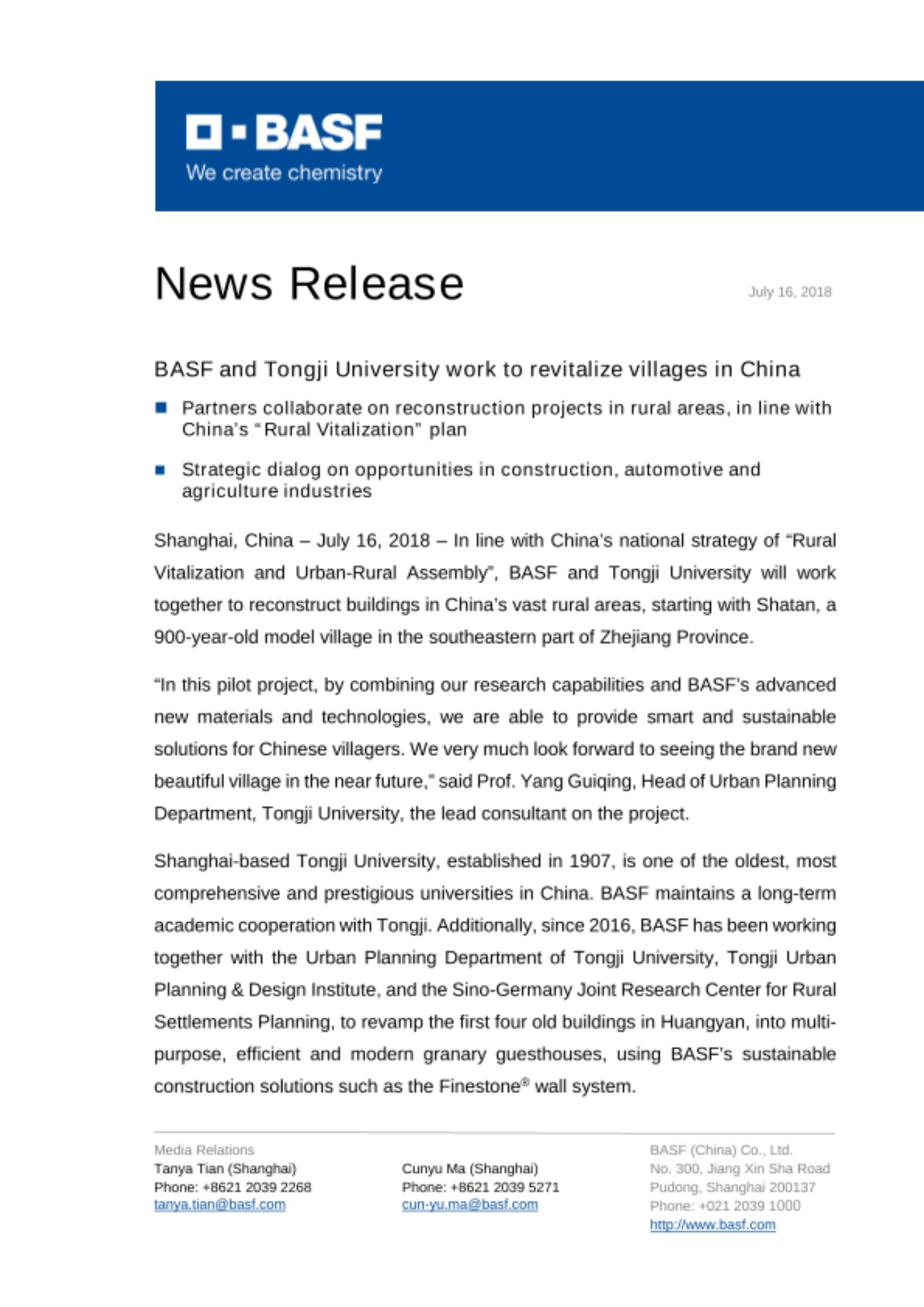“Together with Tongji University, we are excited to transform Chinese villages such as Huangyan. This is an important new endeavor for BASF,” said Dr. Zheng Daqing, Senior Vice President, Business & Market Development, BASF Greater China. “At the same time, BASF’s three key industry teams will explore further cooperation opportunities in academic research and innovation with Tongji. In this strategic dialog we are not only reflecting on our previous achievements, but also exploring future partnerships that can bring smart solutions to Chinese customers.”