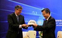 Chongqing, China – September 15, 2018 – Sanjeev Gandhi, member of the Board of Executive Directors, BASF SE, responsible for Asia Pacific, presents a BASF safety helmet to Li Dianxun, Vice-Mayor of Chongqing, during this year’s meeting of the Chongqing Mayor’s International Advisory Council. The gift honors five million safe working hours of methylene diphenyl di-isocyanate (MDI) production at the BASF site in Chongqing.