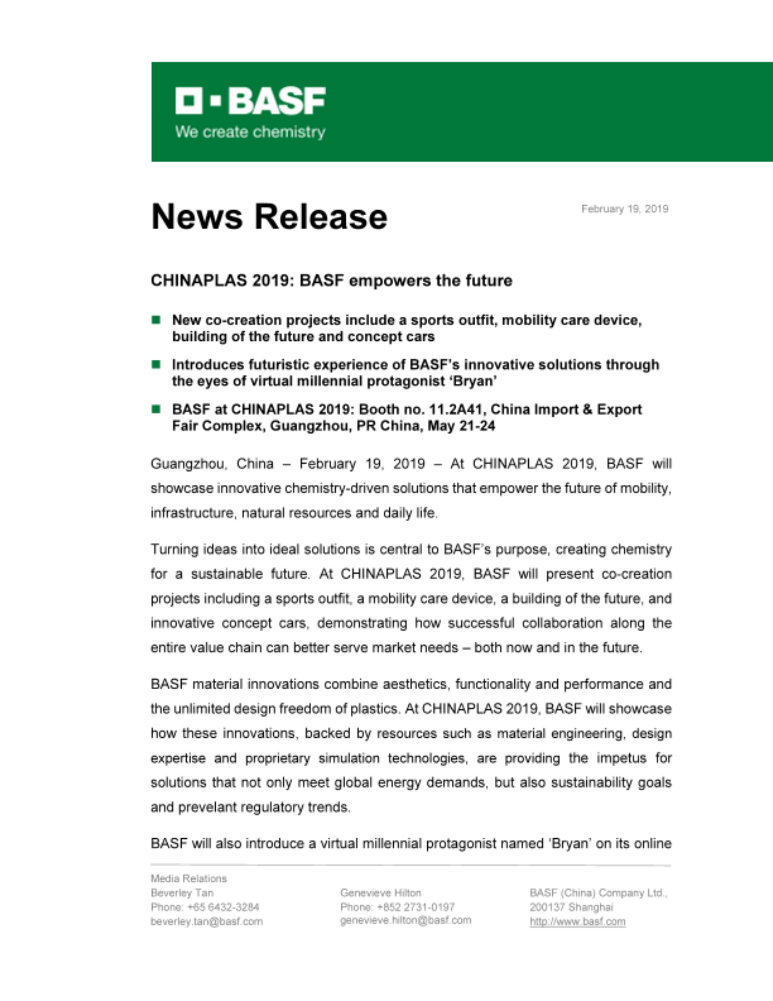 Guangzhou, China – February 19, 2019 – At CHINAPLAS 2019, BASF will showcase innovative chemistry-driven solutions that empower the future of mobility, infrastructure, natural resources and daily life.