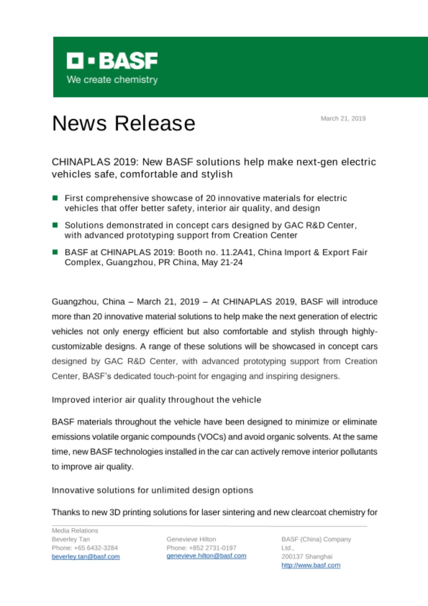 Guangzhou, China – March 21, 2019 – At CHINAPLAS 2019, BASF will introduce more than 20 innovative material solutions to help make the next generation of electric vehicles not only energy efficient but also comfortable and stylish through highly-customizable designs. A range of these solutions will be showcased in concept cars designed by GAC R&D Center, with advanced prototyping support from Creation Center, BASF’s dedicated touch-point for engaging and inspiring designers.