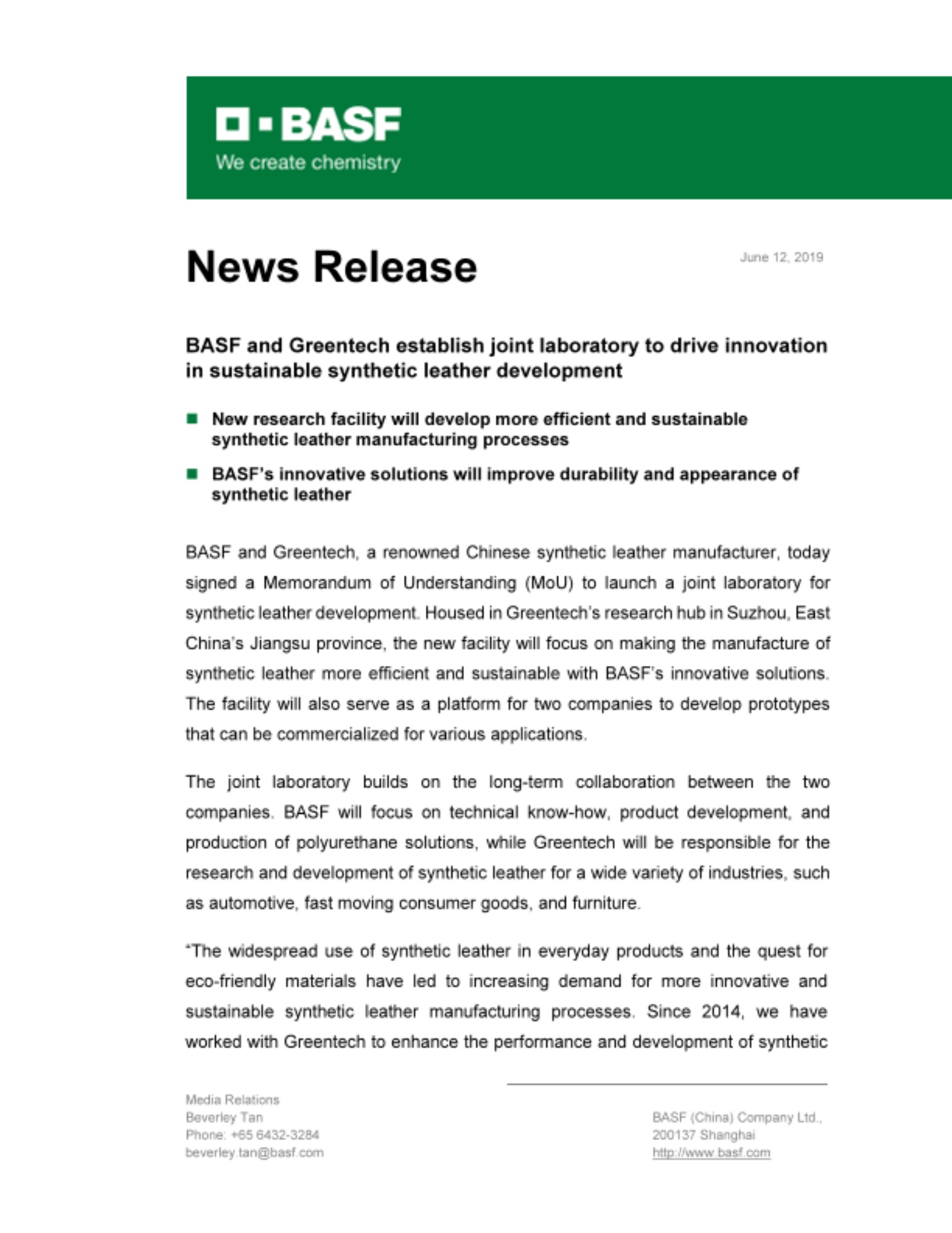 “We approached BASF for collaboration as we wanted to tap into their expertise in developing sustainable synthetic leather without the use of organotin or other solvent based technologies. Through the joint research facility with BASF, we hope that we can develop breakthrough innovations that meet and exceed our customers’ expectations for the new generation of synthetic leather,” said Mr. Gao Jingang, Chairman, Suzhou Greentech Material Co. Ltd.