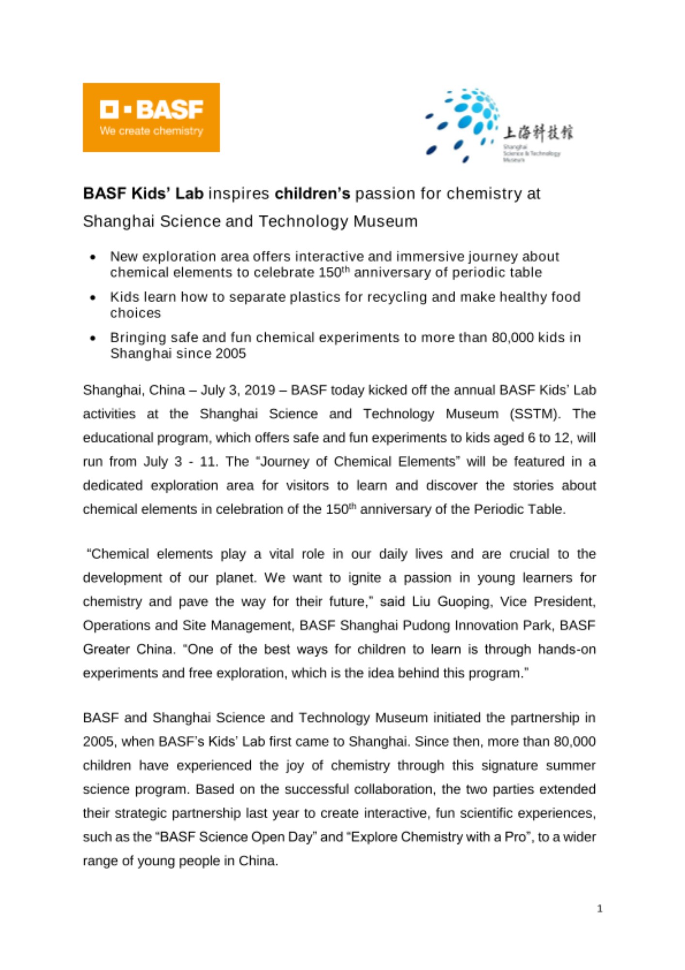 Shanghai, China – July 3, 2019 – BASF today kicked off the annual BASF Kids’ Lab activities at the Shanghai Science and Technology Museum (SSTM). The educational program, which offers safe and fun experiments to kids aged 6 to 12, will run from July 3 - 11. The “Journey of Chemical Elements” will be featured in a dedicated exploration area for visitors to learn and discover the stories about chemical elements in celebration of the 150th anniversary of the Periodic Table.
