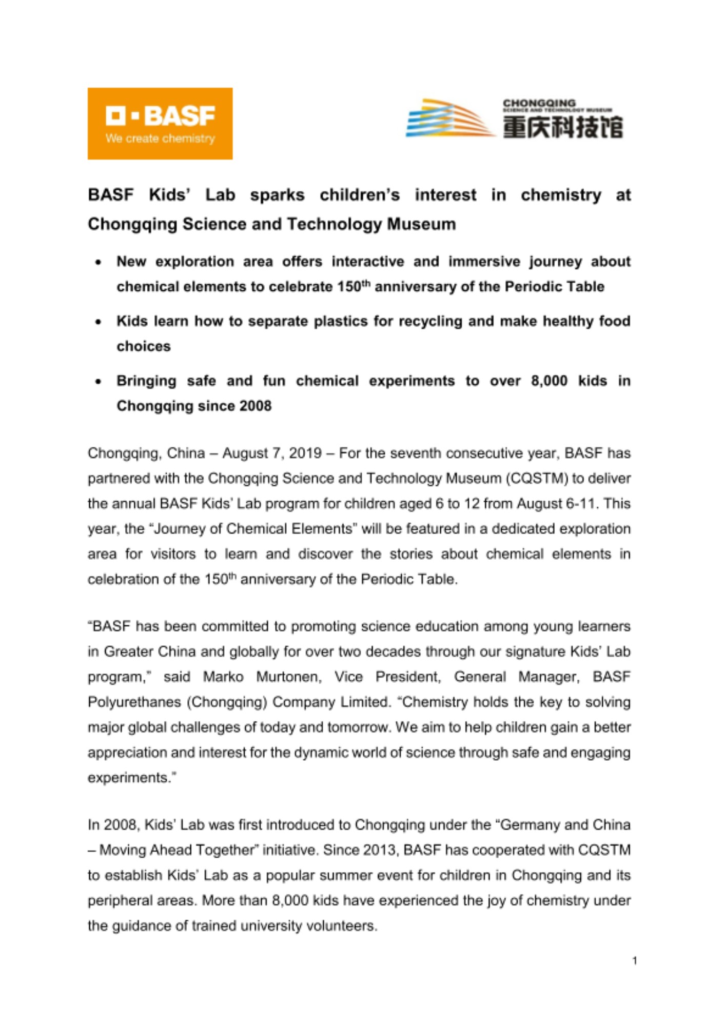 Chongqing, China – August 7, 2019 – For the seventh consecutive year, BASF has partnered with the Chongqing Science and Technology Museum (CQSTM) to deliver the annual BASF Kids’ Lab program for children aged 6 to 12 from August 6-11. This year, the “Journey of Chemical Elements” will be featured in a dedicated exploration area for visitors to learn and discover the stories about chemical elements in celebration of the 150th anniversary of the Periodic Table.