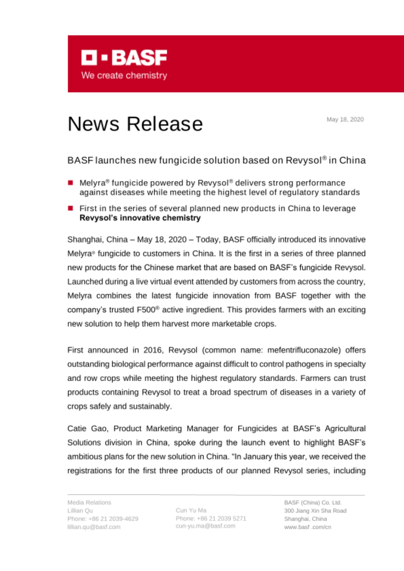 Shanghai, China – May 18, 2020 – Today, BASF officially introduced its innovative Melyra® fungicide to customers in China. It is the first in a series of three planned new products for the Chinese market that are based on BASF’s fungicide Revysol. Launched during a live virtual event attended by customers from across the country, Melyra combines the latest fungicide innovation from BASF together with the company’s trusted F500® active ingredient. This provides farmers with an exciting new solution to help them harvest more marketable crops.